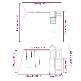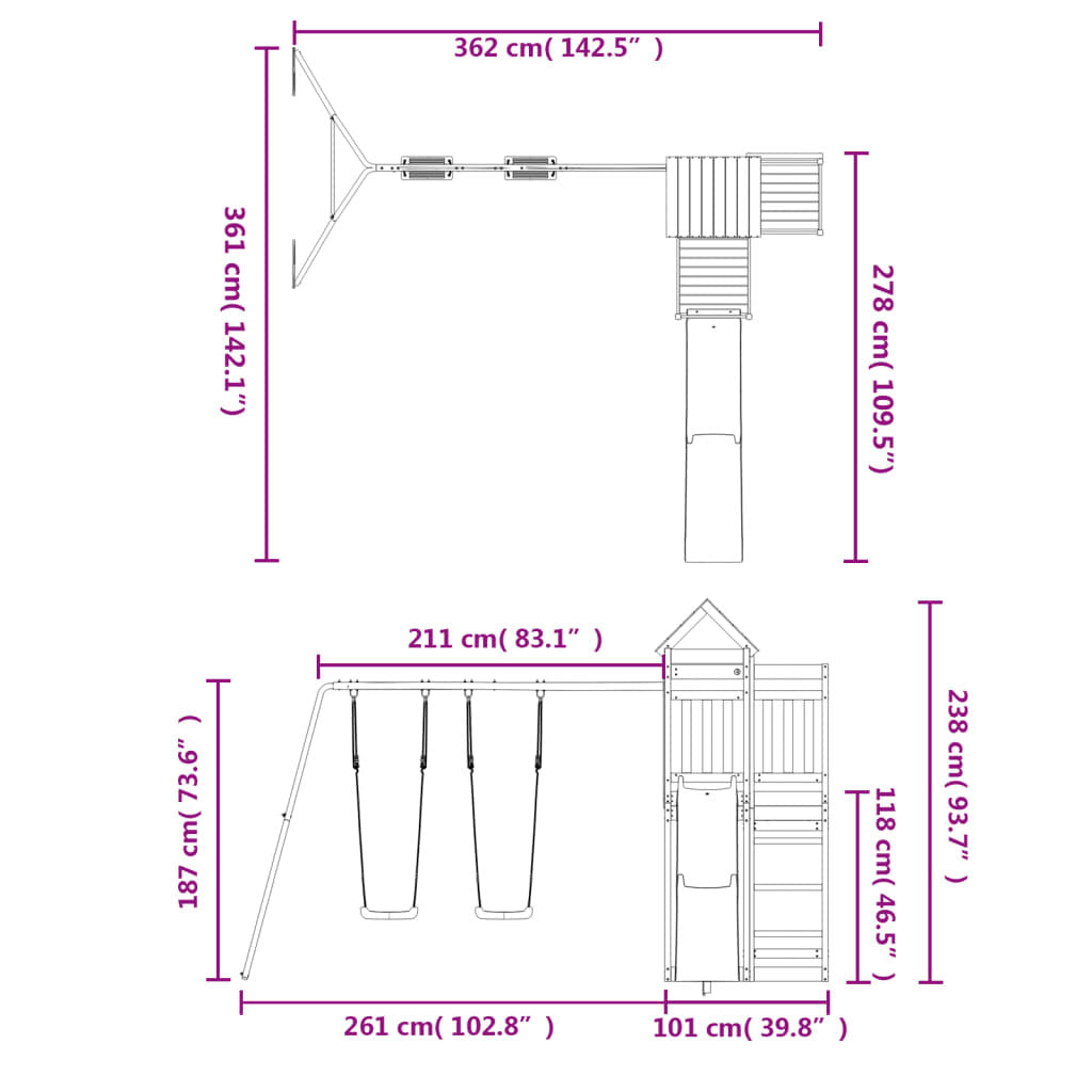 Play tower: Material: Solid douglas wood (untreated) Dimensions: 39.8" x 43.7" x 93.7" (L x W x H) Wave slide: Color: Blue Material: PP (Polypropylene) Size: 82.7" x 15.7" (L x W) Double swing set: Color: Blue Material: PP (Polypropylene) Overall dimensions: 102.8" x 72.8" x 73.6" (L x W x H) Swing dimensions (each): 12.6" x 8.7" x 55.1" (L x W x H)