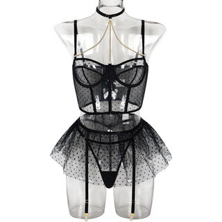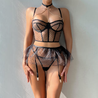 Elevate your allure with this European and American-inspired polka dot lingerie three-piece set. Designed to hug your curves, it features a close-fitting silhouette enhanced by a sexy chain with a steel ring detail. The transparent fabric adds a daring touch, making it perfect for intimate moments. Experience confidence and seduction combined in one stunning set.