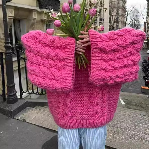 Our Flared Sleeve Knitted Loose Fit Sweater features a half-open collar, durable materials, and classical design for multiple occasion options. The main fabric is polyester.