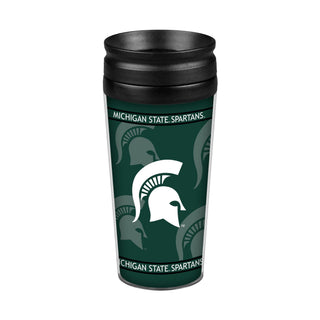 Double-walled, plastic travel tumbler with full wrap graphics on paper insert. Screw on Lid. BPA Free.