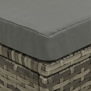 This patio lounge set combines style and functionality and will become the focal point of your garden or patio. The whole furniture set is designed to be used outdoors year-round. Thanks to the weather-resistant and waterproof PE rattan, the lounge set is easy to clean, hard-wearing and suitable for daily use. The seat set features a sturdy powder-coated steel frame, which is highly durable. It is also lightweight and modular, which makes it completely flexible and easy to move around to suit any setting. The thick, removable cushions are highly comfortable. The cushion covers can be easily removed and washed. Note: We recommend covering the sofa set in the rain, snow or frost. Rattan color: Gray Cushion color: Anthracite Material: PE rattan, powder-coated steel Cushion material: 100% polyester Overall dimensions: 104.7" x 90.6" x 27.2" (W x D x H) 2-Seater corner sofa dimensions: 53.1" x 26.4" x 27.2" (W x D x H) 3-Seater corner sofa dimensions: 72.4" x 34.6" x 27.2" (W x D x H) Long ottoman dimensions: 36.2" x 24.4" x 11.4" (L x W x H) Short ottoman dimensions: 28.7" x 24.4" x 11.4" (L x W x H)