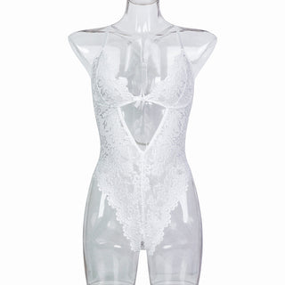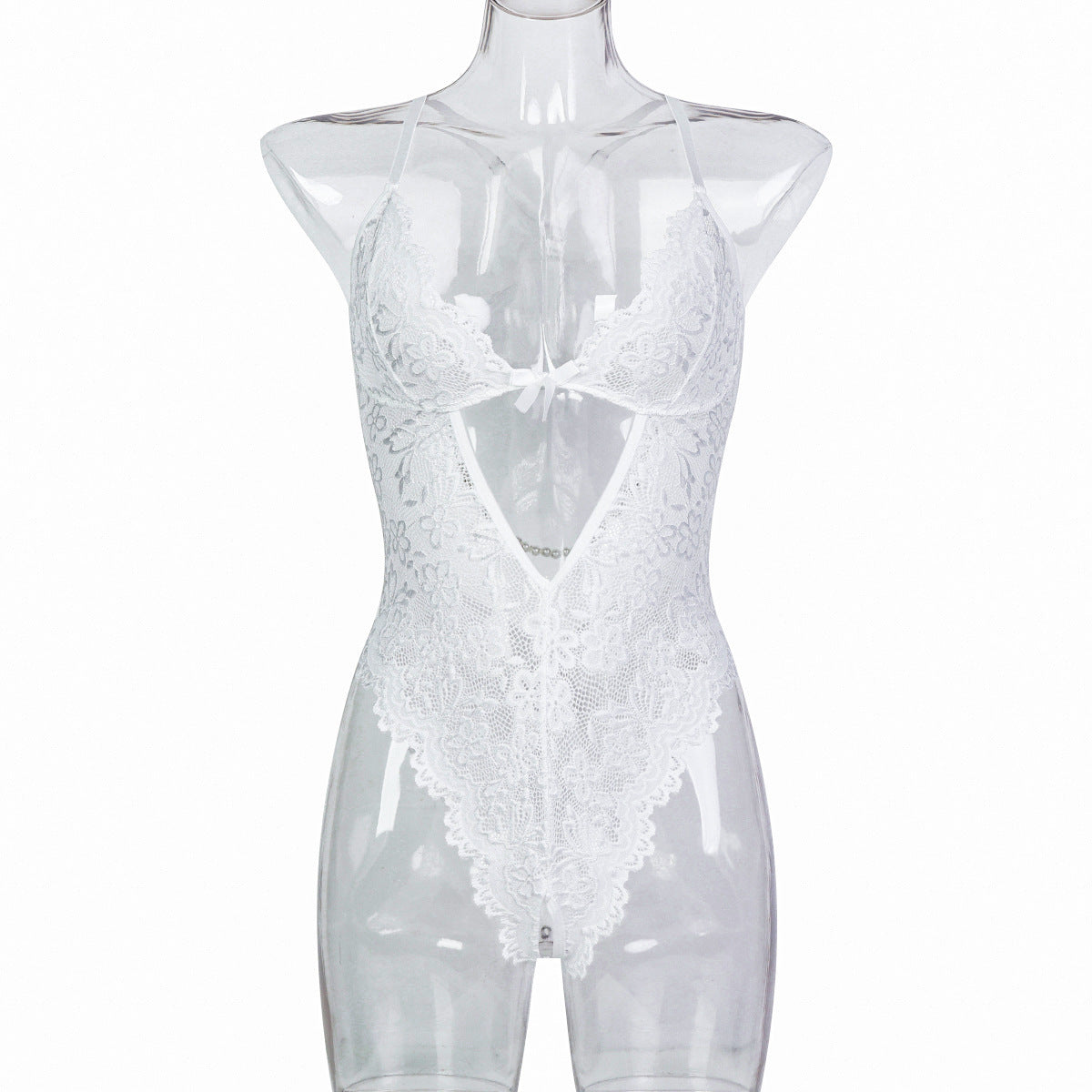 Elevate your allure with this backless white lace bodysuit featuring delicate pearl strips and thigh-high straps. Crafted to highlight your curves, it combines sexy elegance with a daring design, perfect for intimate moments or special occasions where confidence is key. The intricate lace and pearl accents add a touch of sophistication, ensuring you feel as stunning as you look.