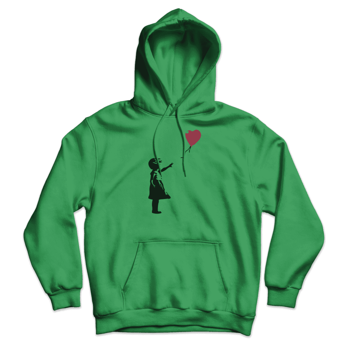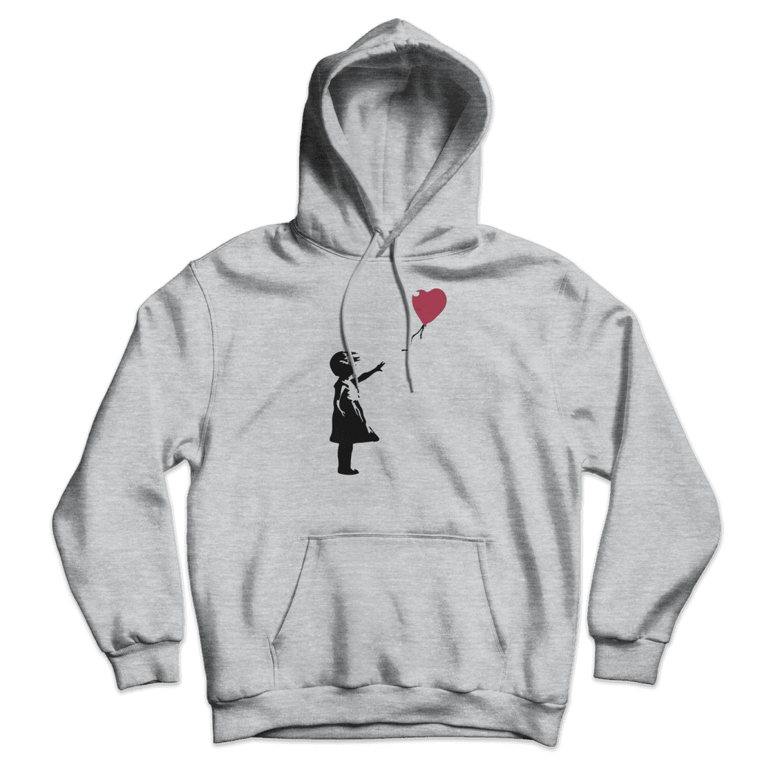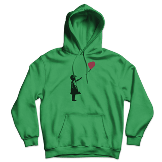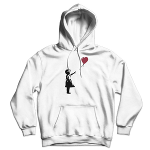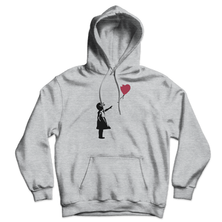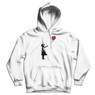 This hoodie has a famous artwork originally created by the mysterious artist Banksy. It shows a young girl with her hand extended toward a red heart-shaped balloon carried away by the wind. The first work was on Waterloo Bridge, and other murals were around London, though none remain there. Banksy has several times used variants of this design to support social campaigns.