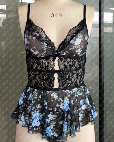 Embrace allure and elegance with this butterfly knot splicing lace mesh jumpsuit. Featuring a delicate floral print and transparent design, it highlights your curves with a backless cut that feels both daring and sophisticated. The intricate lace mesh adds a soft, sensual texture, while the butterfly knot detail brings a touch of unique charm. Perfect for intimate evenings, this lingerie piece is designed to make you feel confident and unforgettable.