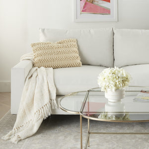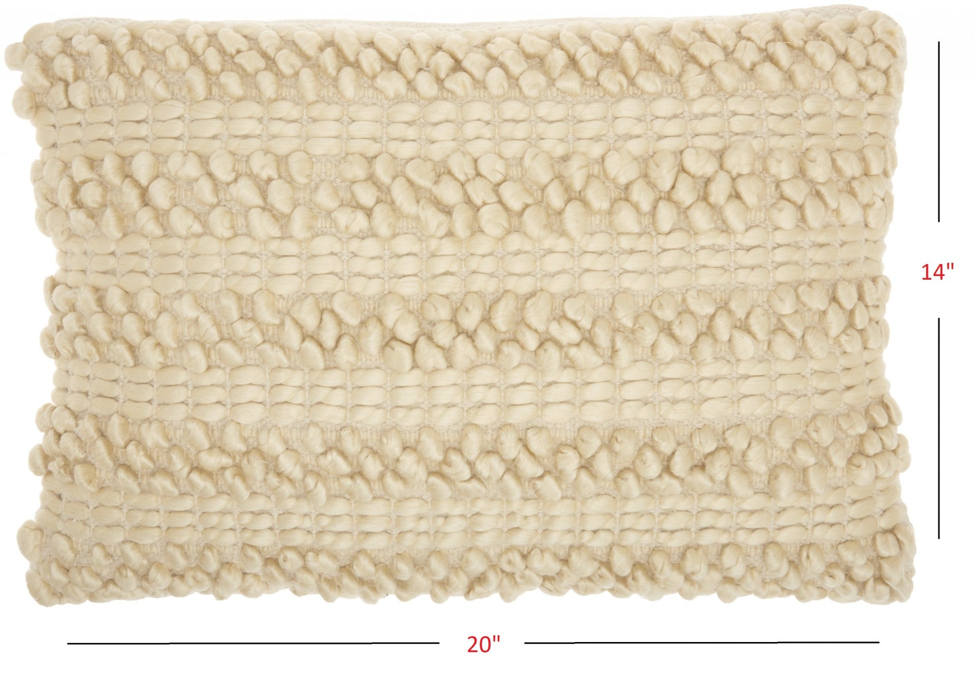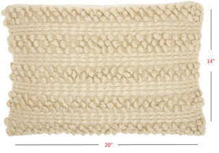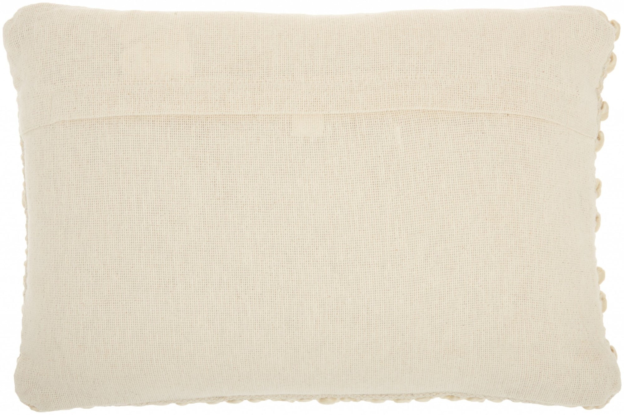 Add a touch of unique design and comfort to any seating space in your home with this Cream Pom-Pom Detailed Lumbar Pillow. This pillow has a rectangular shape with a hidden zip closure at the back for a seamless look. The cover is covered in a cream colored fabric which has a striped design on top of it. There are two designs in the stripes with one stripe with an embroidered pattern and one stripe with a textured small pop-pom pattern. These stripes alternate and give a very textured feel to the pillow. You can use this pillow anywhere in your home and it will work with any existing colors or decor style you already have, You can use this pillow to elevate the look of your bed, your couch, or your favorite chair. This lumbar pillow also provides excellent back support. 5" H x 14" W x 20" D