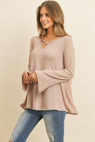 A classic solid print adorns this soft detailed top. Featuring a criss-cross neckline, bell sleeves with bell trim, and a relaxed bodice. Pair with skinny jeans and mules when it's warm, and then add a cardigan and switch to knee-high boots when cool weather rolls in.