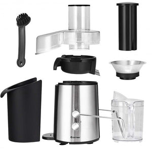 Overall dimensions: 15" x 8" x 15.5" (L x W x H) Material: PP + ABS + Stainless steel Color: Black + Sliver Rated voltage: 120 V Rated power: 700 W Rated frequency: 60 Hz Net weight: 8.7 lbs plup collector volume: 68 fl oz Juice jug volume: 34 fl oz Package included: 1 x Juice extractor 1 x Cleaning brush 1 x Plup collector 1 x Juice Jug 1 x Manual Measurement: 16.93" x 13.58" x 9.45" - Brand new and high quality - Beautiful design and simple operation - Designed with the 75mm wide feeder chute which can easy to extract the whole fruit or vegetables without pre-cutting or slicing - High-speed motor with overheat protection high efficiency time saving and energy saving - All the parts are detachable and they can be easily assembled and cleaned by the cleaning brush included - The safety lock unit for switching is specially designed to ensure the safety and reliability in use - For added safety the juicer will only turn on when the lid has been locked in place with the locking arm