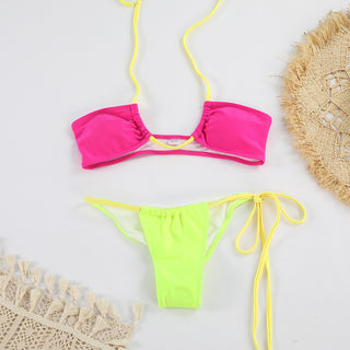 This stylish two-piece bikini features a shiny nylon fabric with a bold color block design and adjustable straps, combining comfort and allure. Perfect for making a confident statement at the beach or pool, it offers a flattering fit that enhances your silhouette with a modern European and American flair. Elevate your swimwear collection with this sexy, eye-catching set designed to turn heads.