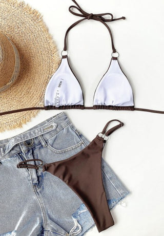 Embrace the satisfaction of the sea in this sexy bikini featuring adjustable triangle cups, halter straps, a tie back closure, and matching bottoms with a low rise front, and a thong cut back.