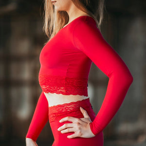 Ultra-feminine long sleeve crop top with lace. Fitted design to flatter every size. Layer it over your favorite Dragonfly sports bra. We love it with high-waisted Adriana leggings or high-waisted Betty shorts. The Pavi crop top works for the studio and for the street. Super stretchy, lightweight fabric is soft and comfortable.