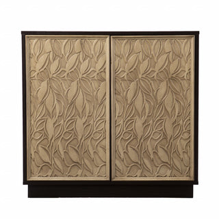 Breath a breath of fresh into your room with this with this Brown and Cream Sculptural Leaf Accent Storage Cabinet. Inspired by nature, this push to open double door cabinet features four cubbies spaces inside for storage and an exquisite carved leaf design on the front panels. The light cream of the front is a great contrast to the dark black body and top that makes this versatile piece a great option for most any room in the house. Hide your bar items, board games, extra blankets, and what ever you need to stow away but do it fashionably! 30.3" x 31.5" x 18"SHIP FROM : USASHIP TO : USA