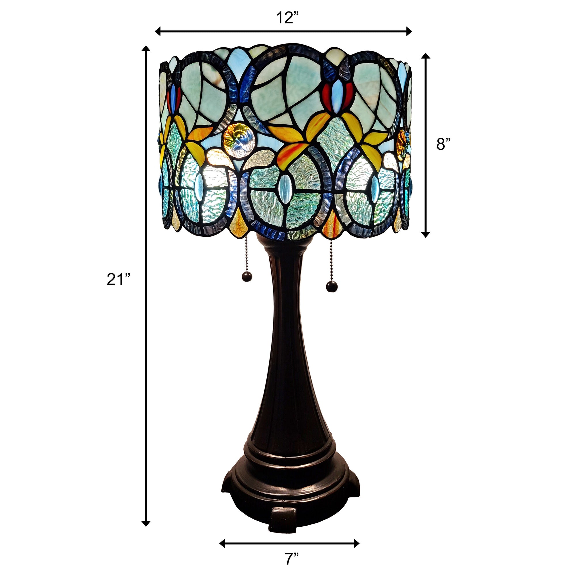 This 21" Tiffany Style Jeweled Floral Drum Table Lamp will add a touch of elegance to your space. The lampshade blends various hues of handcrafted glass pieces with rich jewels to create an elaborate design that will add flair to any home, regardless of its current decor. You can only be left impressed each time you turn on the two featured lights and pull chains for easy control. The matte brown tone of the fixture complements the multicolored glass shade design. 11" x 22" x 22"SHIP FROM : USASHIP TO : USA