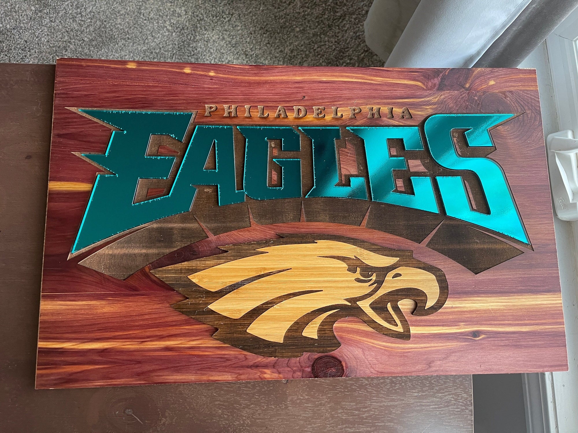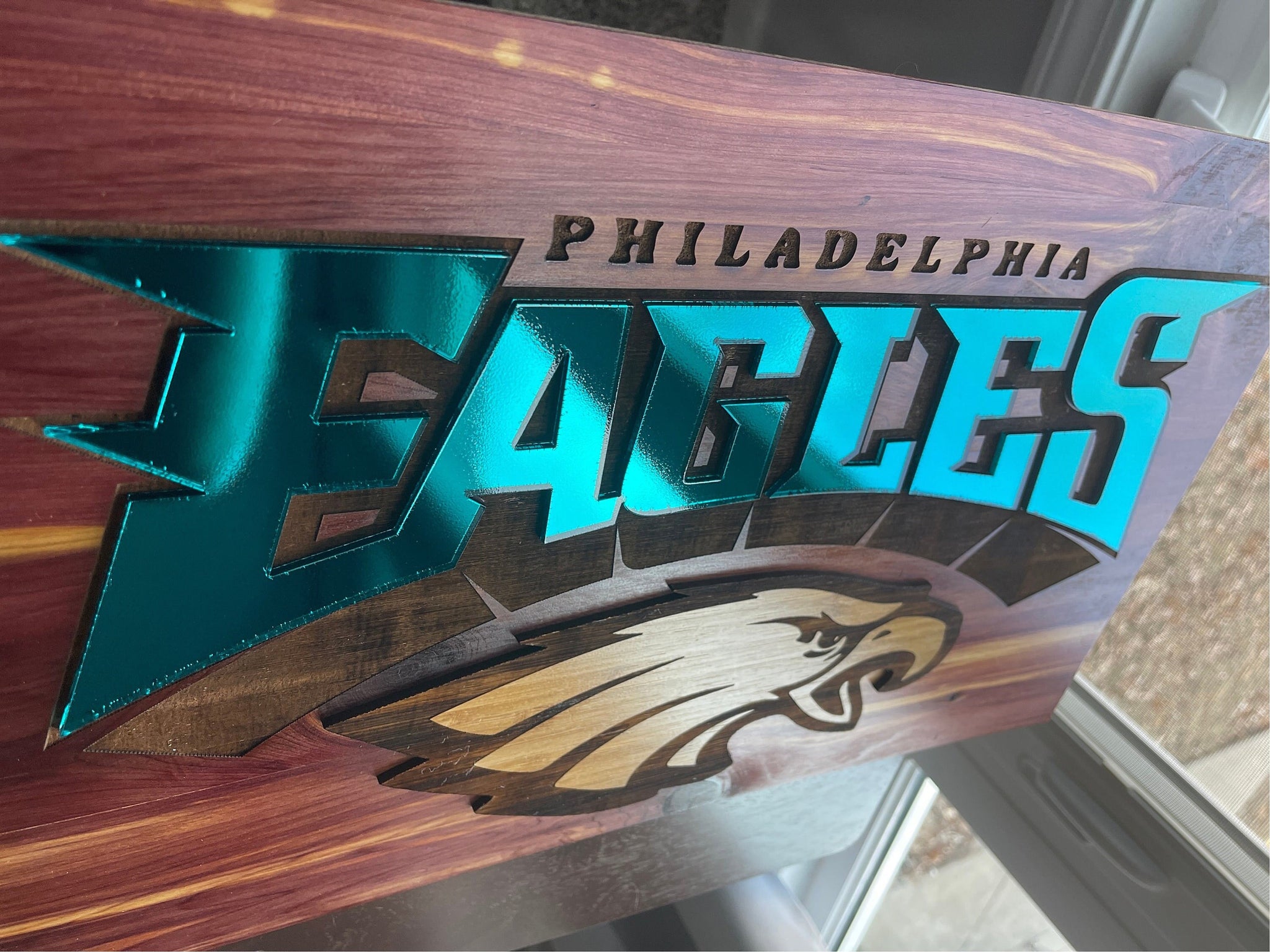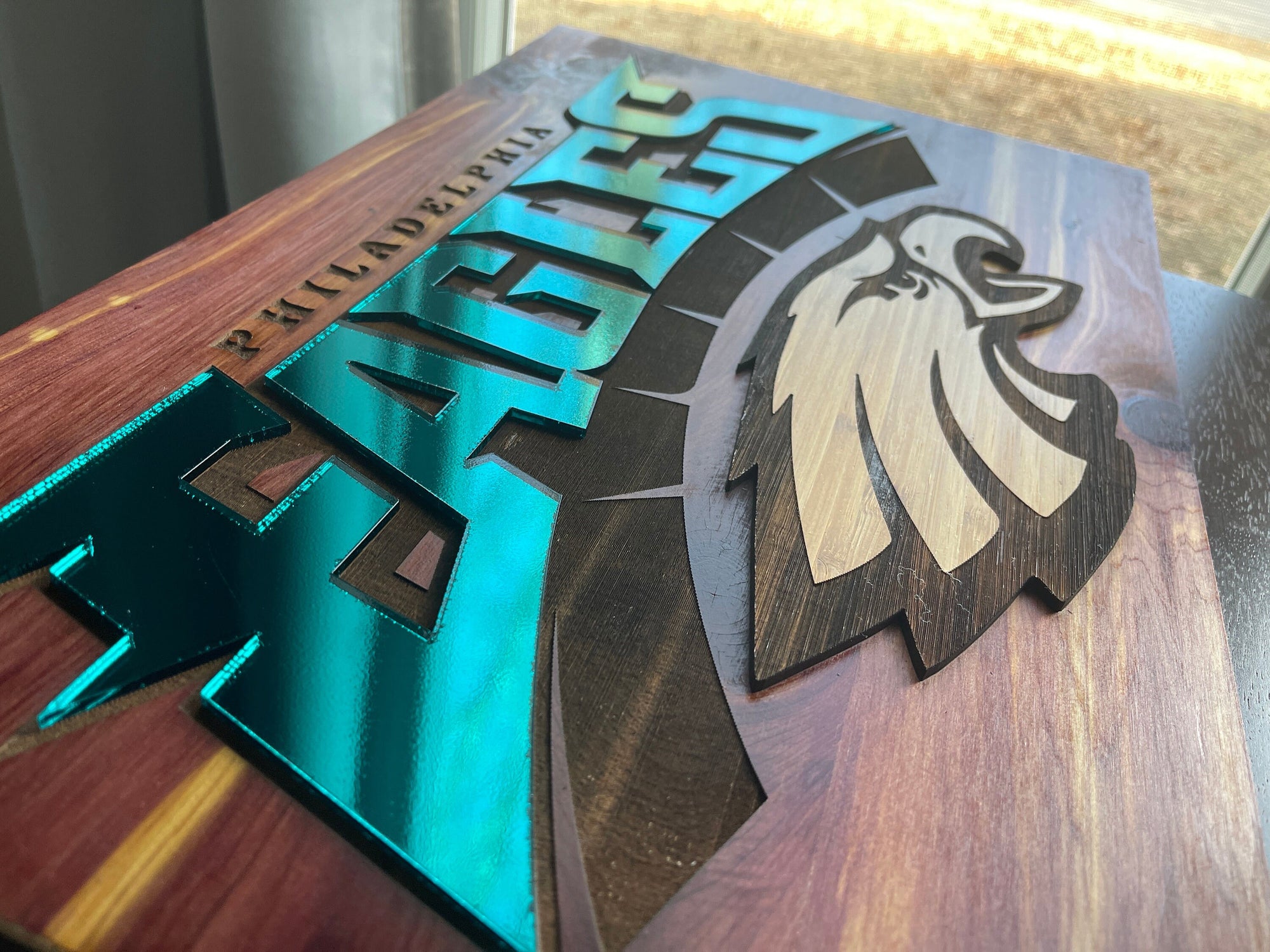 Featuring The Eagles NFL Team logo in raised, mirrored acrylic on wood. Laser engraved details give this sign depth and character.