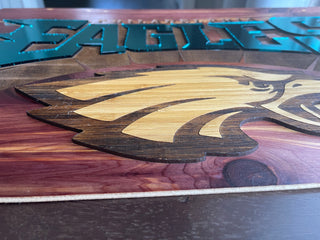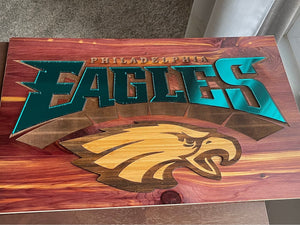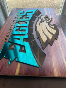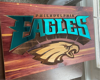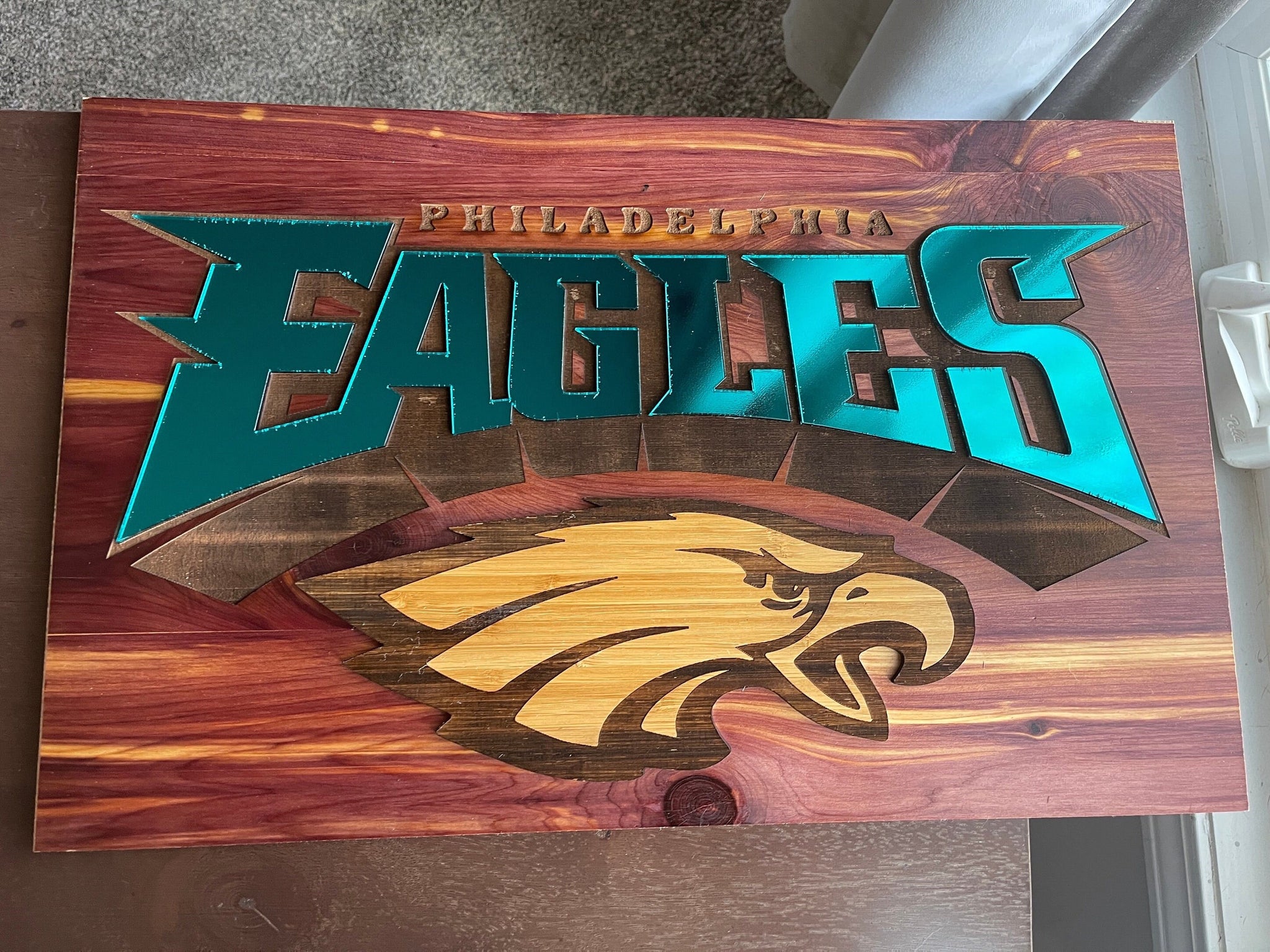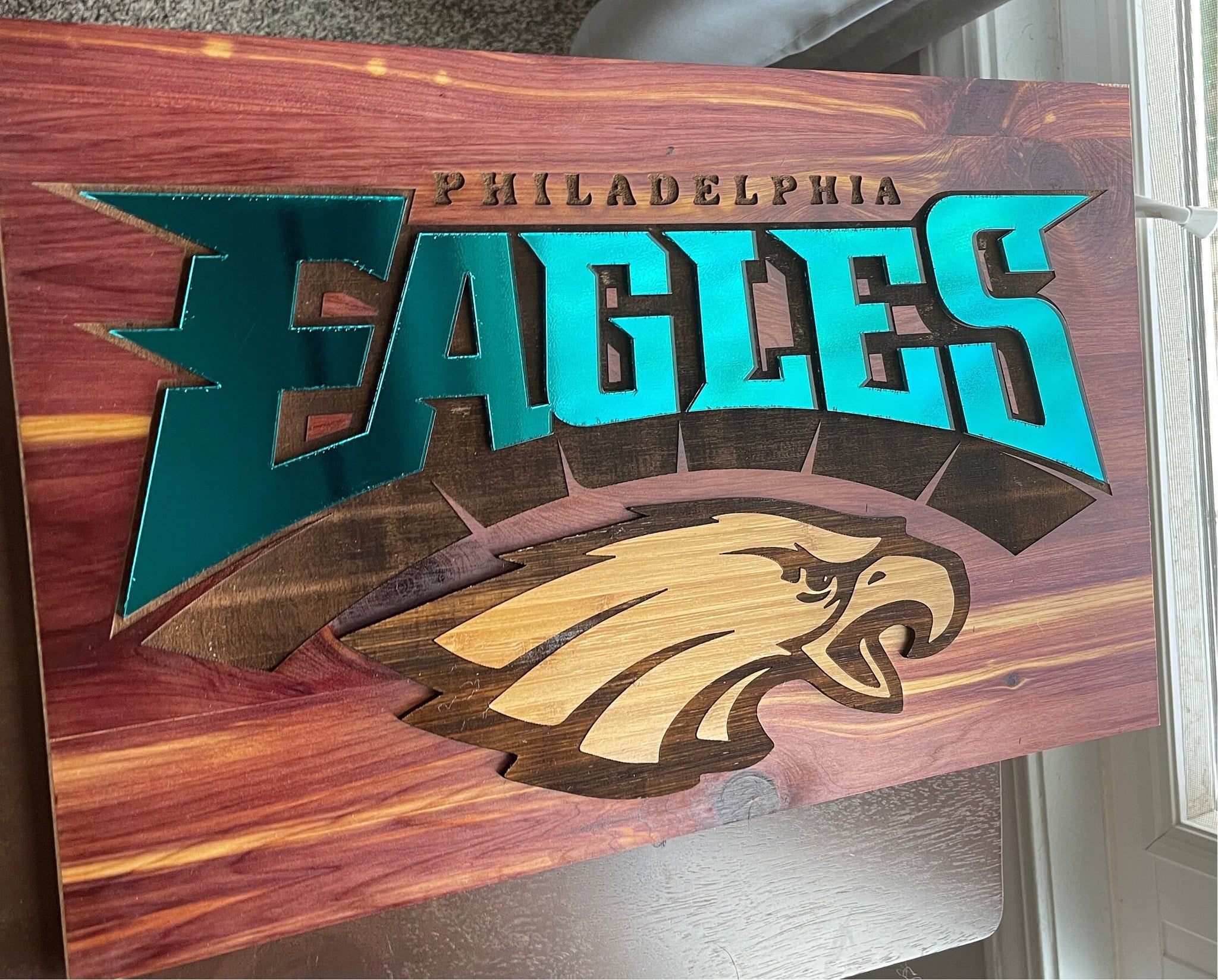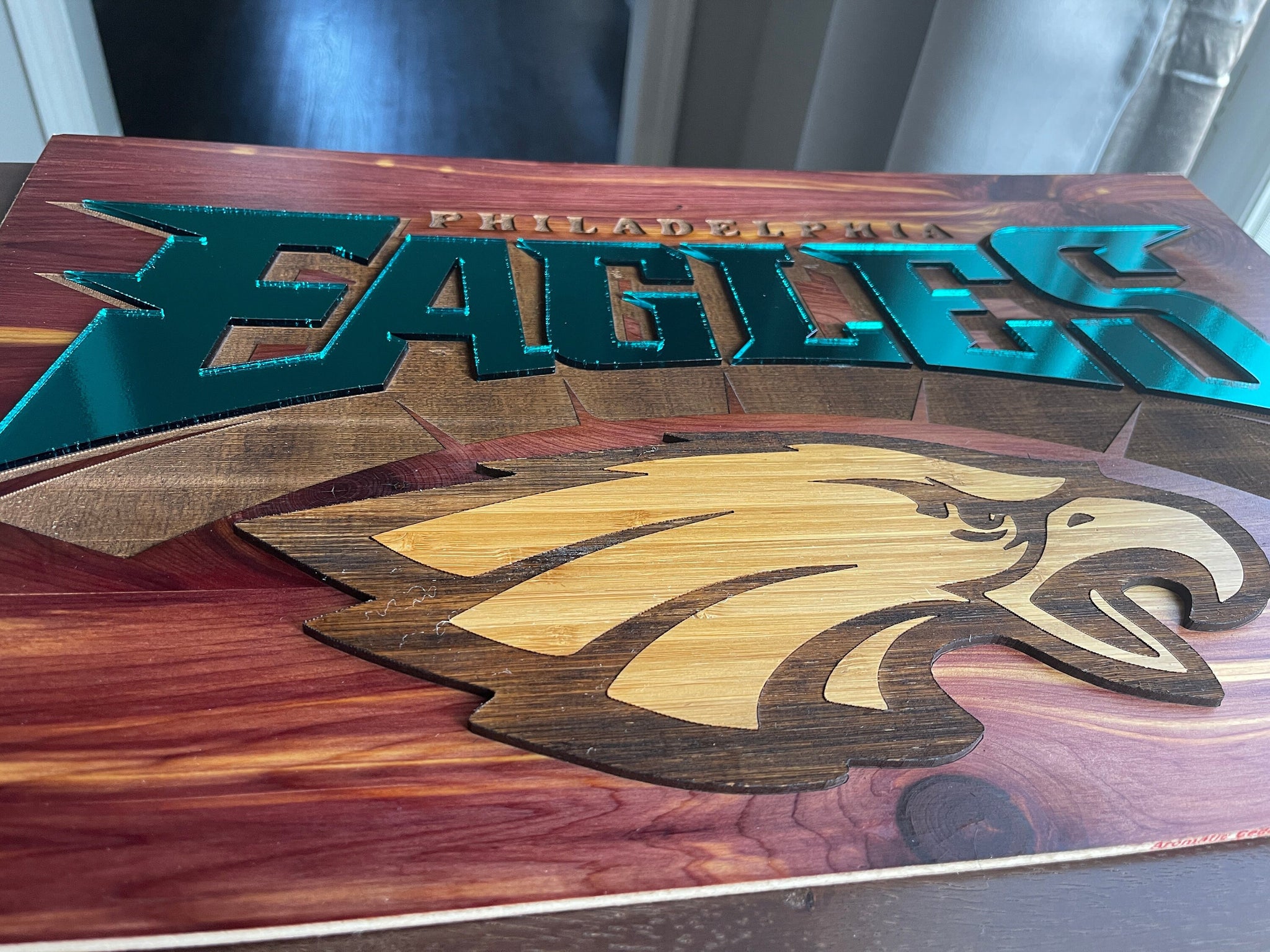 Featuring The Eagles NFL Team logo in raised, mirrored acrylic on wood. Laser engraved details give this sign depth and character.