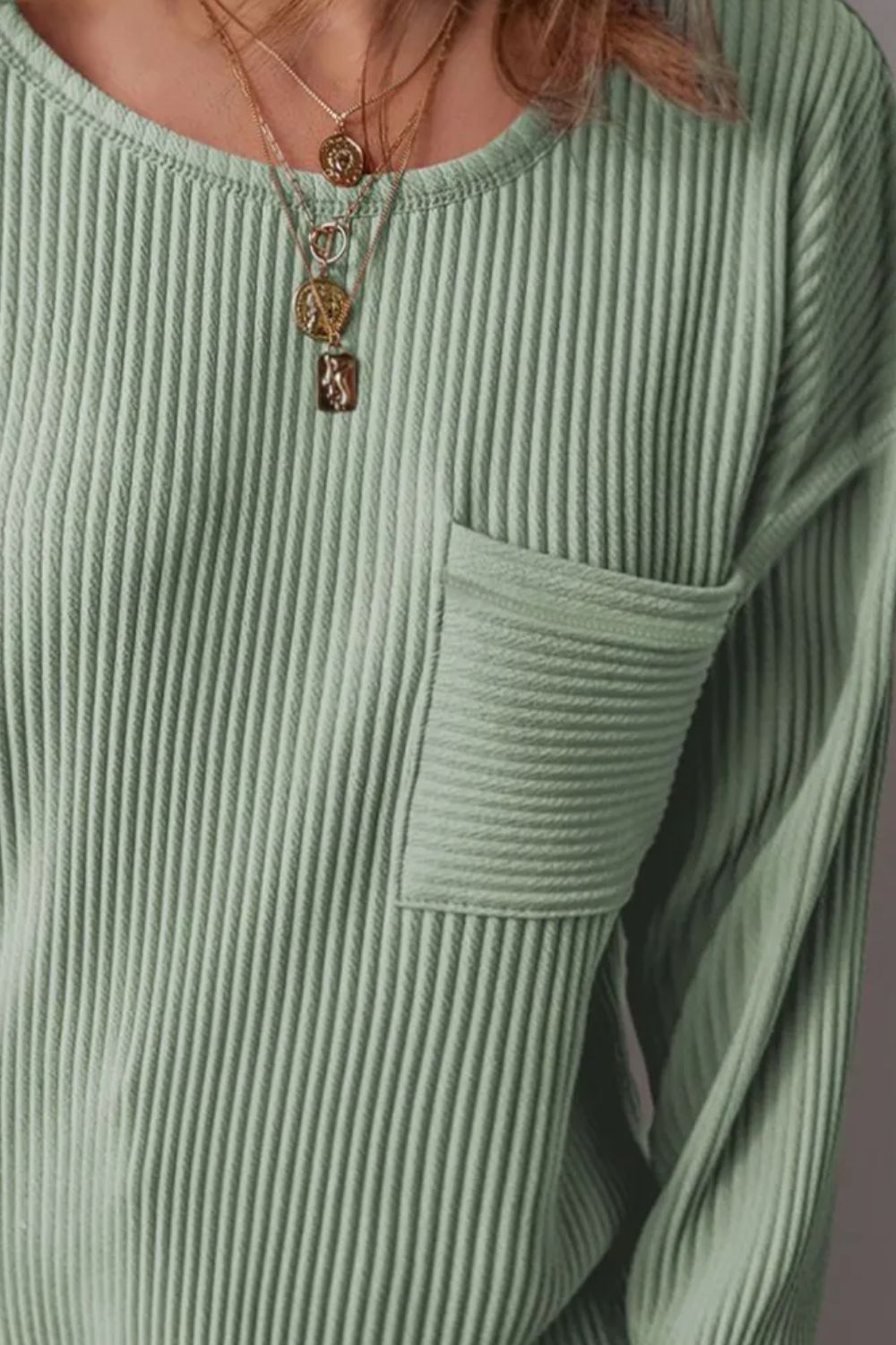 Plus Size Pocketed Ribbed Round Neck Long Sleeve Top