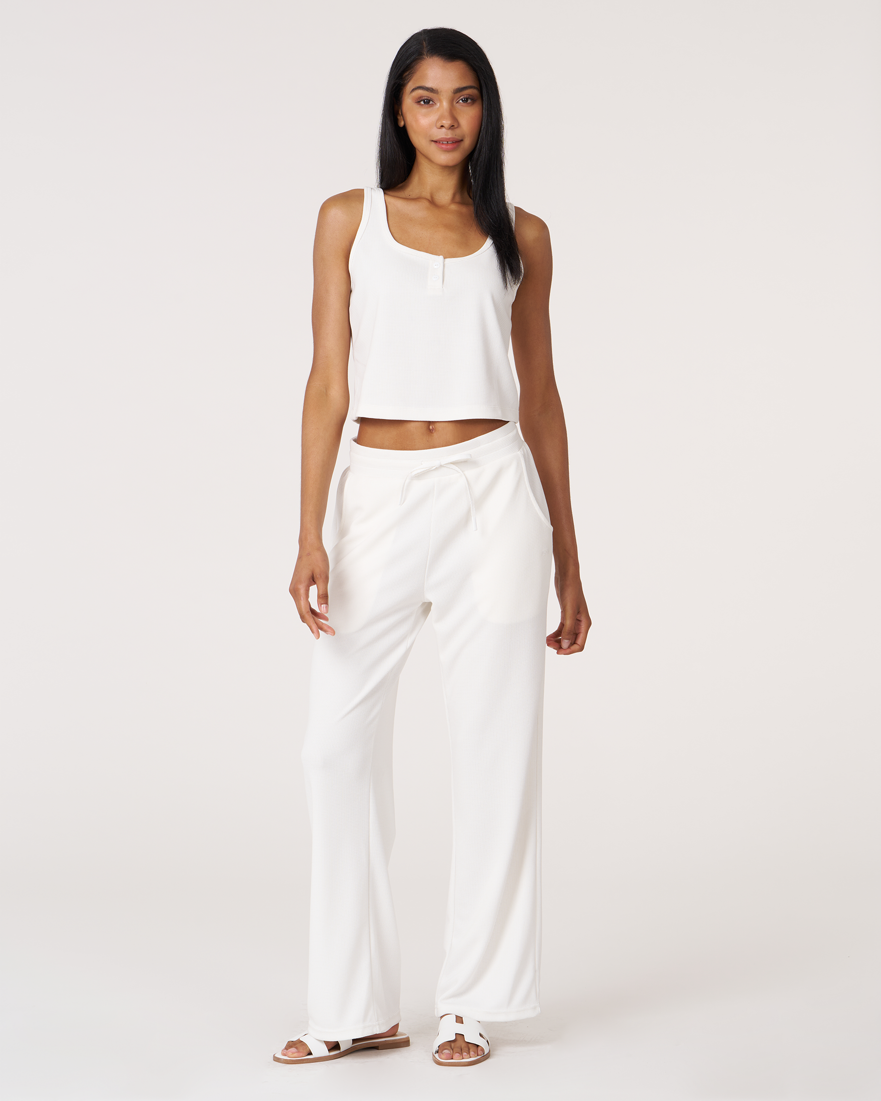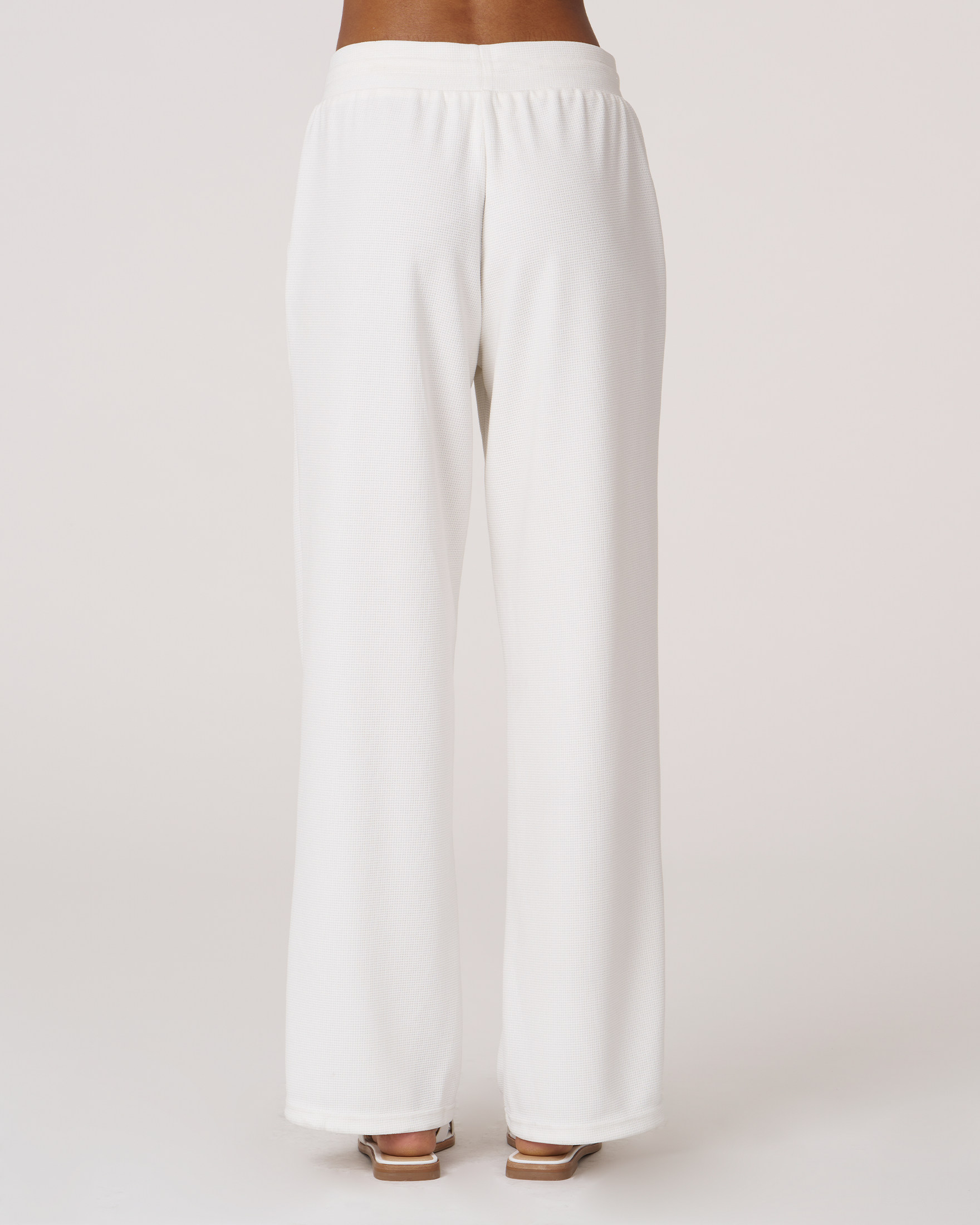 Made with a relaxed fit and designed to maintain its shape, these wide leg pants provide the perfect balance of comfort and style. Features pockets and an encased elastic waist with drawstring to adjust the fit. Ideal to wear for travel, errands, or weekend lounging. The waffle-knit exterior has a cotton-like feel for comfort and sweat-wicking interior to keep you cool and dry. Lightweight and drapey, it's made from a luxurious blend of 49% modal, 45% polyester, 6% Spandex.