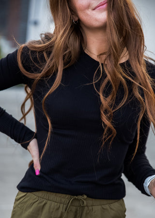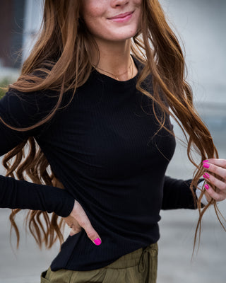 This ribbed long-sleeve tee is perfect for layering!  Wear it under your favorite graphic tee or Jumpsuit to transition into cooler weather.
