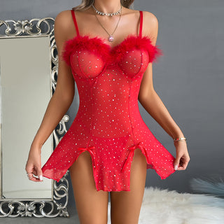 Elevate your evening look with this Sexy Black Two-Piece Set, featuring dazzling rhinestone crystals and elegant feather accents. Crafted from sheer elastic mesh, it offers a flattering fit while the daring slit adds a touch of allure. Perfect for making a statement at any special event, this dress combines glamour and comfort seamlessly.