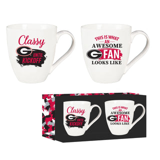 A boxed set of two 17oz ceramic mugs featuring the team logo and colors. Reads: 'This is what an awesome fan looks like' and 'Classy until kickoff'. Comes with matching gift box.