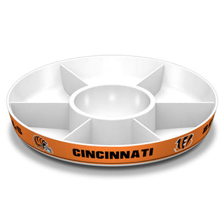 Snack in spirited style with this versatile Party Platter! Bright and bold 14 1/2" dia. melamine platter features your favorite football team graphics and colors and can be used alone or with custom dividers. Includes 6 removable dividers and a dipping bowl, so you can choose from 7 different serving configurations by simply sliding the slotted pieces together. Specify team. Hand wash with mild soap.