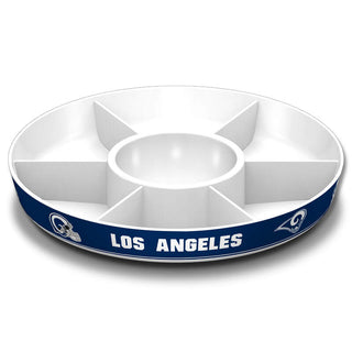 Snack in spirited style with this versatile Party Platter! Bright and bold 14 1/2" dia. melamine platter features your favorite football team graphics and colors and can be used alone or with custom dividers. Includes 6 removable dividers and a dipping bowl, so you can choose from 7 different serving configurations by simply sliding the slotted pieces together. Specify team. Hand wash with mild soap.