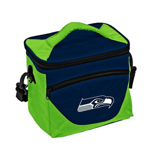 The Halftime Cooler is a practical sized cooler for any outing. It is made with a heat-sealed, leak-proof lining to help keep your snacks or drinks cold. It has a zipper pocket on the front for dry storage. Use the handle on the lid or the detachable shoulder strap. The two-color design features a logo on the front. Holds nine 12oz cans.